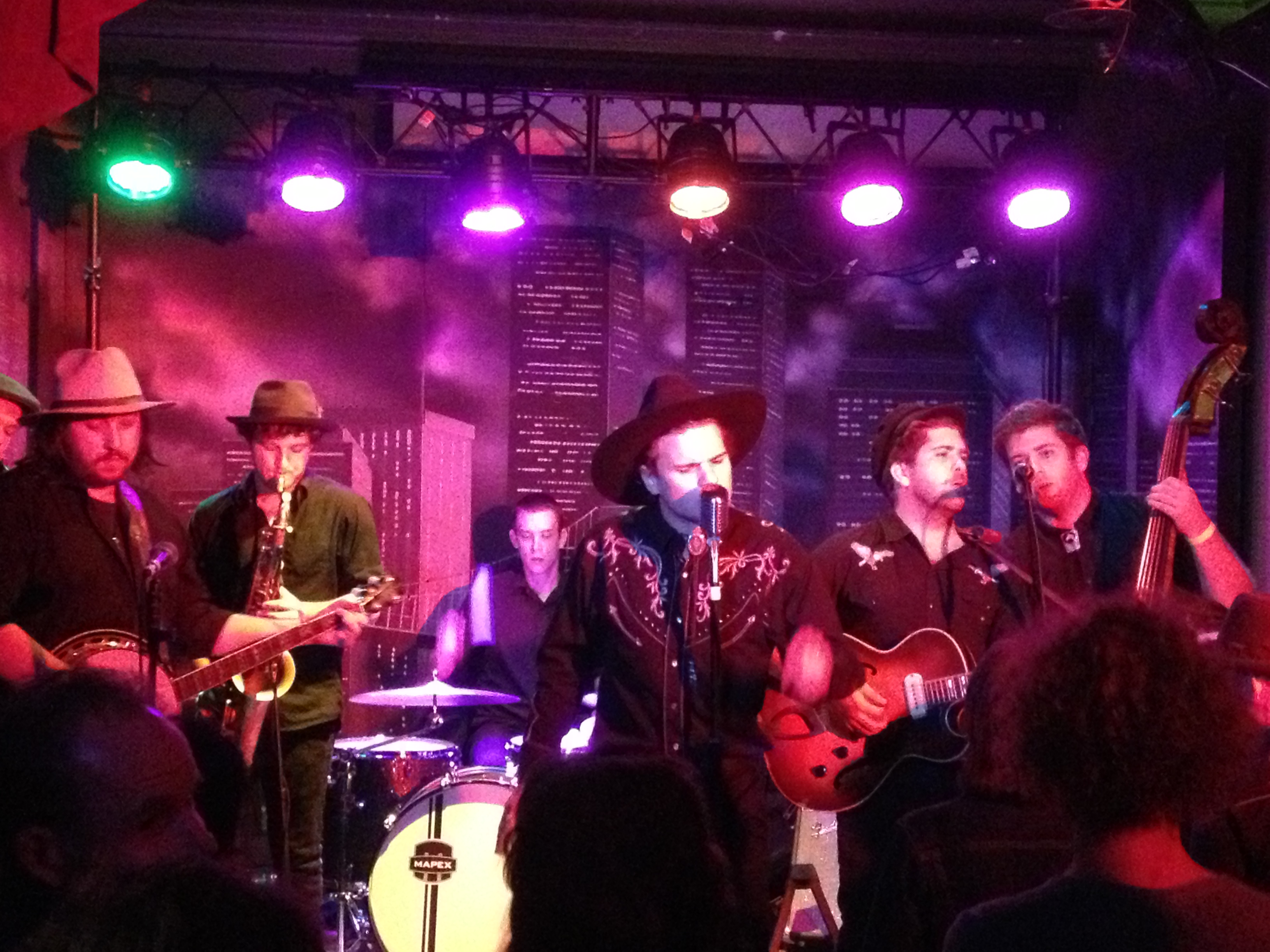 The boys from Papa Pilko and the Binrats have been sinking beers next to the bar all night, so there’s no grand entrance; they simply hop onto the stage and get the show started. Dressed in all black cowboy gear and an array of headgear, the seven piece provide an interesting spectacle, centred on manic frontman Cyrus Pilko. It’s hard to tell how much of his face-contorting, hip-swinging, arm-flailing, and sweat-drenched boot-shuffling is part of a character he has created or if it’s genuinely how he is, but the singer is one of the most entertaining, charismatic, and brilliantly ridiculous Australian front-men around right now; his style is simply infectious and watching him prance and thrash about onstage is worth the admission fee alone. His early admission of “If I hadn’t popped out kids in Sydney I’d move to Brisbane today” gets a loud cheer and roars of laughter.